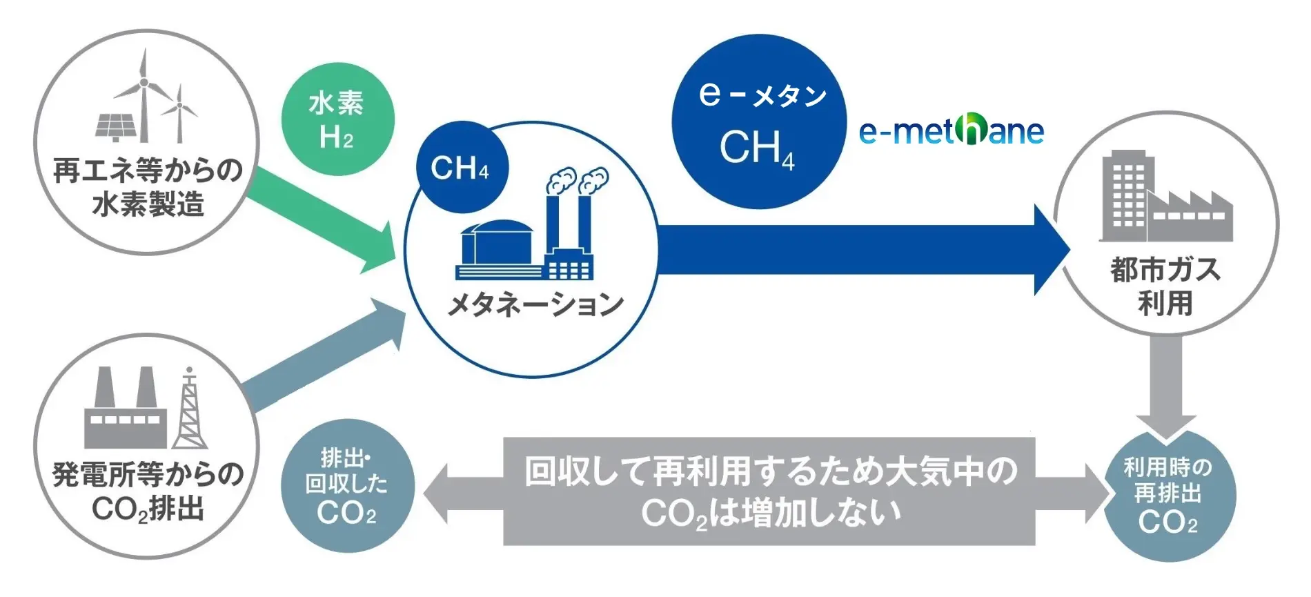 メタンの原料である水素を水の電気分解で生成する際、電力を再生可能エネルギーとして使用すれば、水素生成時にCO₂が発生しないため、e-メタンはカーボンニュートラルなエネルギーとなります。